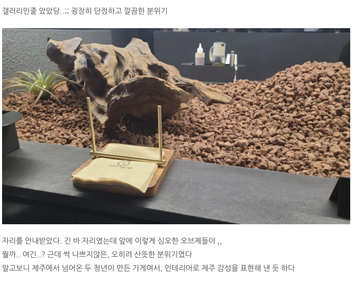 ‘개이쁨’이라는 직설적인 표현에서부터 ‘돌맹이가 아틀라스의 형벌을 받고있다’는 비유적인 표현까지, 네이버 블로그에 게시된 글들 속에는 음식점 치고 공간에 대한 커멘트가 다양했다. 전반적인 분위기를 묘사하기위해 가장 많이 등장하는 표현들은 ‘모던’, ‘시크’, ‘고급진’으로, ‘일반적인 우드톤의 돈카츠 집과는 달라서 신선했다’라는 이야기가 많았다. 연관하여 그 다름 때문에 이 공간은 ‘에스프레소 바’, ‘카페’, ‘소개팅 장소’, ‘전시장’ 으로 사용해도 될 것 같다는 의견도 왕왕 보였다.