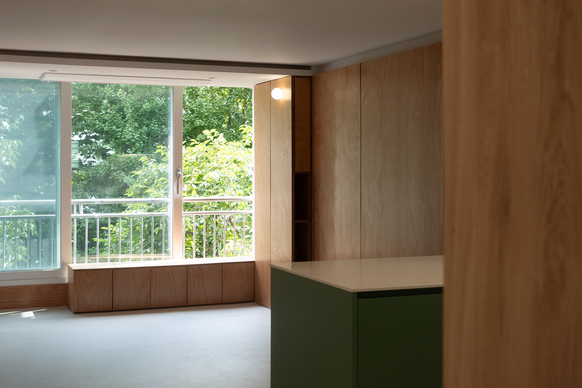 그런 문이 달린 벽들은 막는 대신 드러낸다. 하얀 벽지로 덮어버리기 전에 멈춰 합판을 노출했다. 이 벽에서 흔적은 더이상 흠이 아니다. 액자를 걸기 위해 박았던 못, 손에서 튕겨져나간 연필이 만든 자국, 나무 표면의 제멋대로인 옹이와 변형은 벽에 새긴 나의 시간이다. 벽 위로 흐르는 광택은 창밖 풍경을 벽으로 옮긴다. PVC창호 아래 놓은 벤치는 창밖으로 거실을 이끈다. 집의 이모저모가 초대한다.