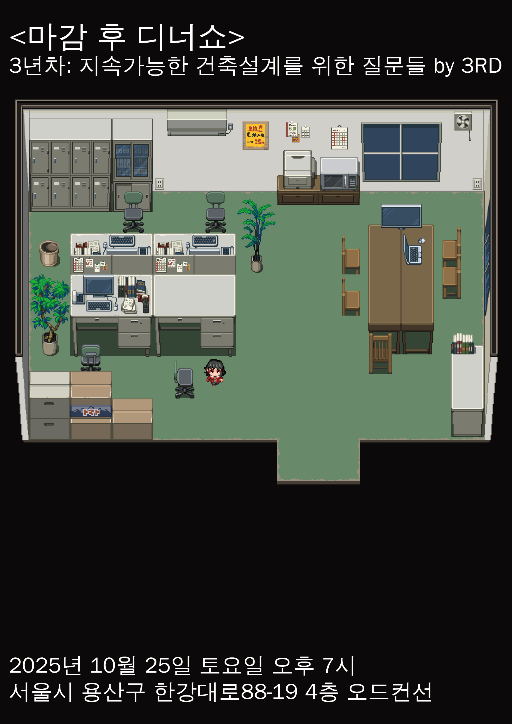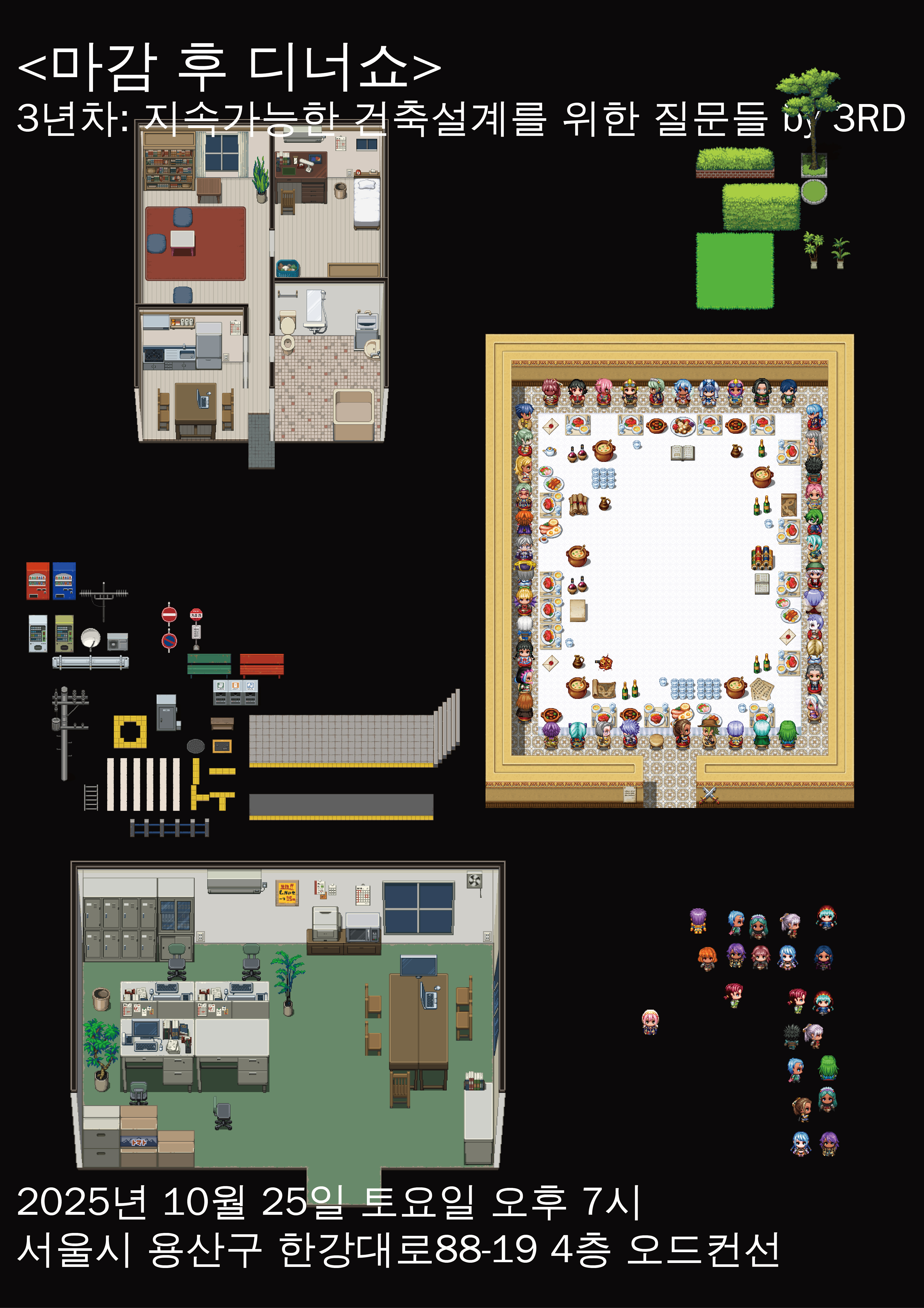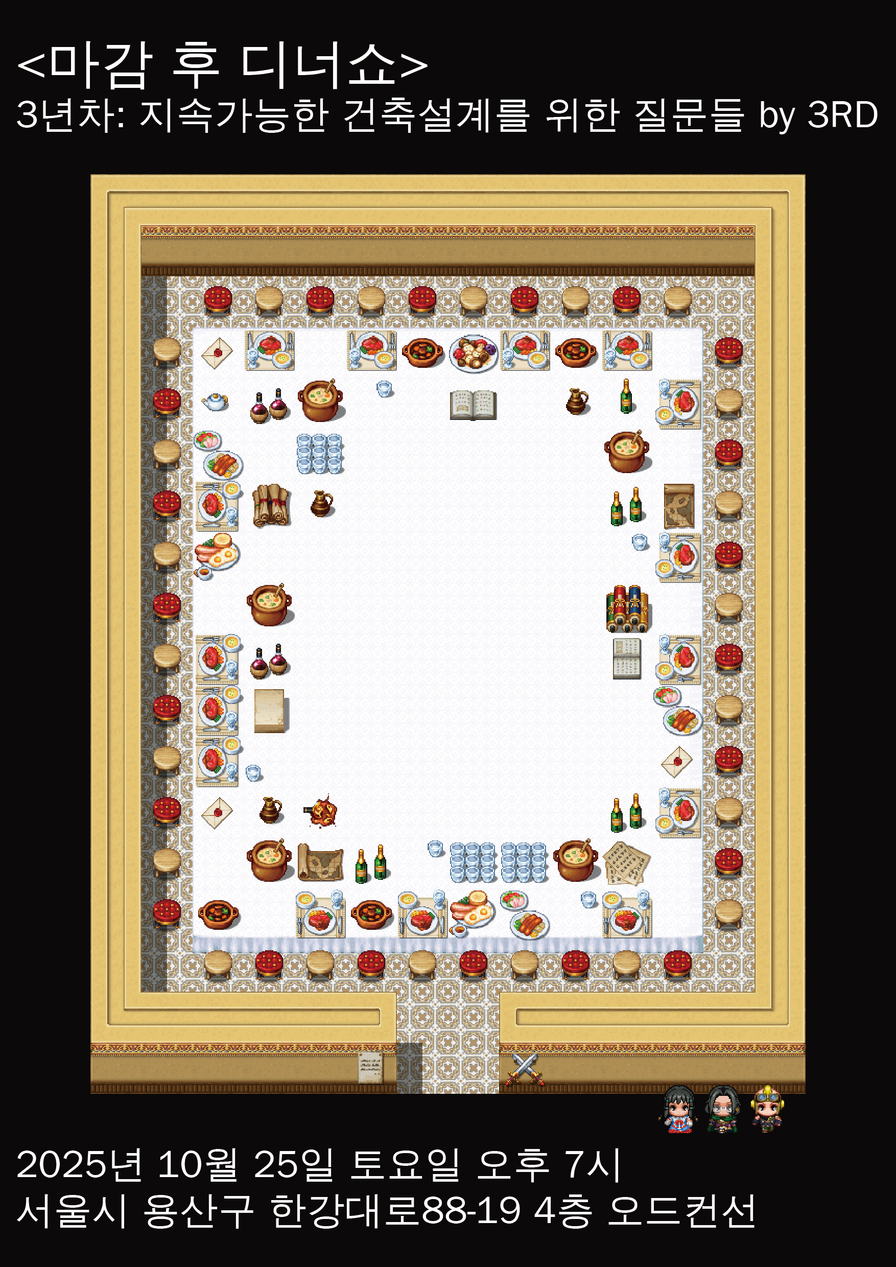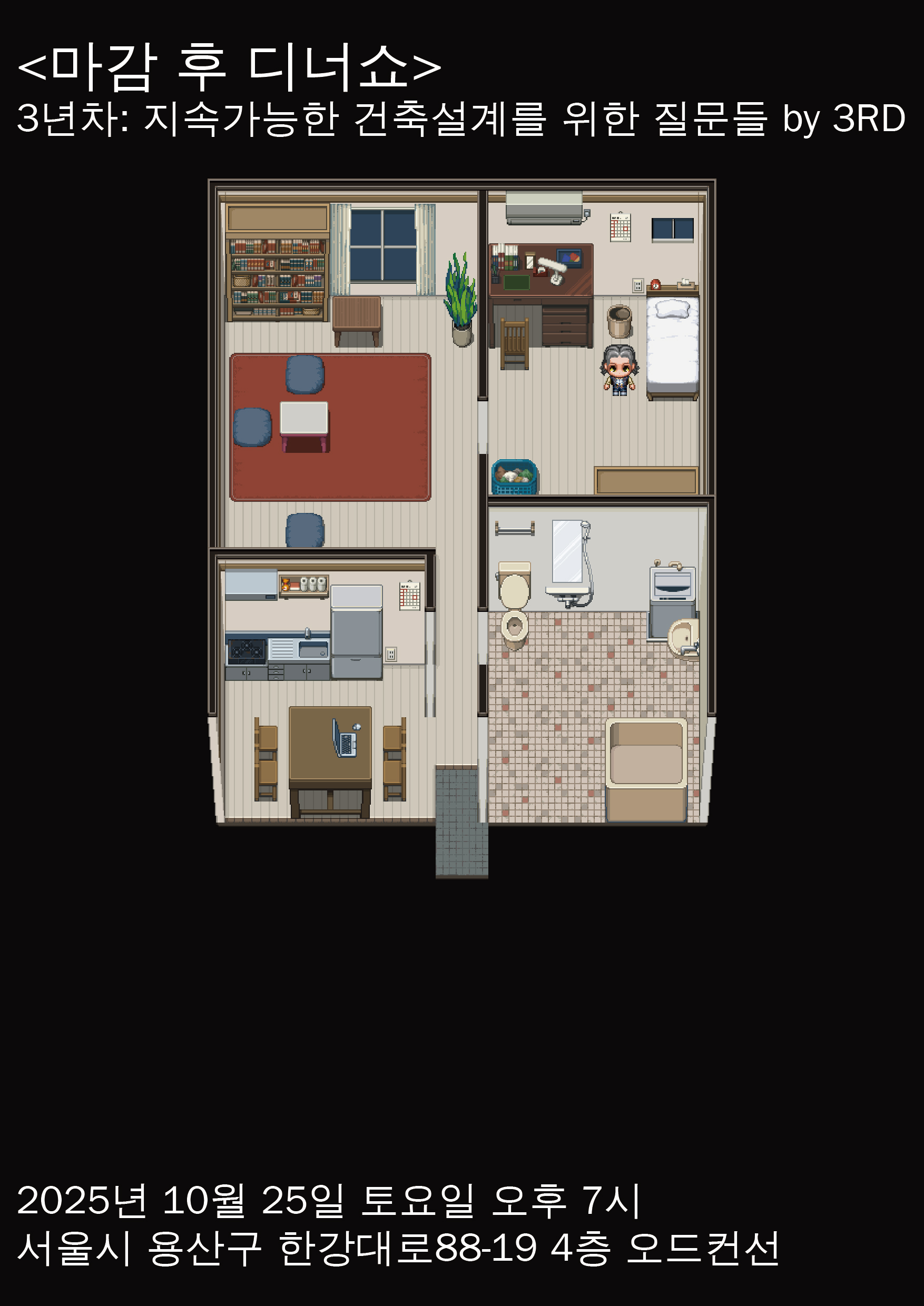 이 연구의 결과는 2025년 10월에 진행한 <마감 후 디너쇼>를 통해 23명의 행사 참여자들에게 공유되었다. 건축 실무자, 학생, 연구자, 큐레이터, 예술가 등 서로 다른 배경의 사람들이 한 테이블에 앉아 각자의 경험과 질문을 나누었다.