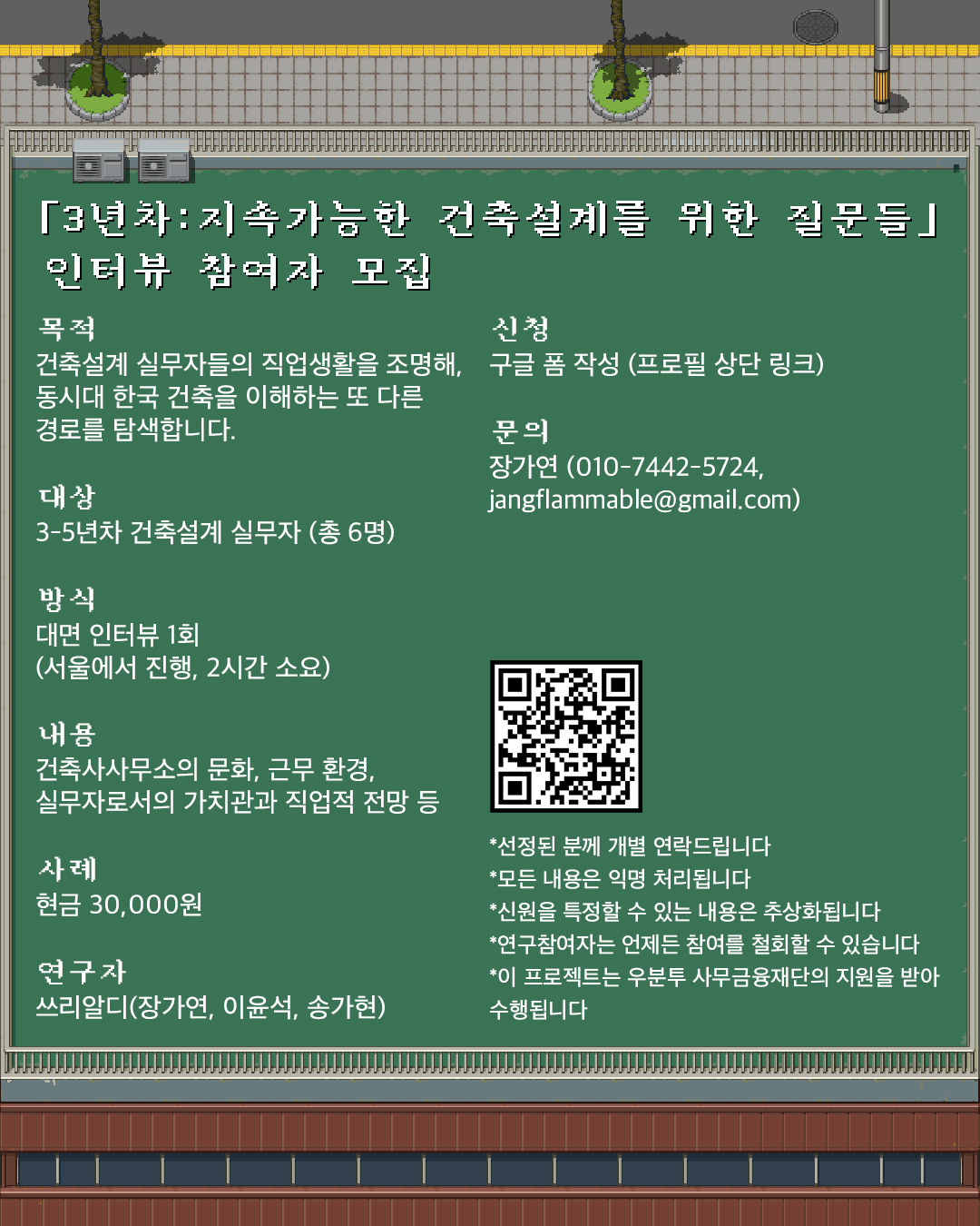 3RD는 2025년 한해 동안 건축 설계 실무자의 노동과 감정을 주제로 질적 연구를 진행했다. 3~5년차 실무자를 중심으로 총 11회의 인터뷰를 수행했으며, 관련 선행 연구 조사와 내부 대담회를 통해 건축 설계 노동이 단순히 ‘노동착취’나 ‘부족한 설계비’로 축약될 수 없음을 확인했다. 그 안에는 제도, 교육, 자부심, 관계 등 서로 다른 층위가 복잡하게 맞물려 있었다.